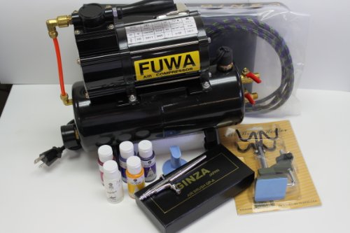 Product Description: Fuwa Air Compressor Airbrush Nail System Kit includes a Fuwa Air Compressor (Model: V-5, Capable of holding 2 airbrush gun at the same time), 1pc Ginza Airbrush Gun GP-A, 1pc Ginza Airhose, 1pc Airbrush Holder, 5 Bottles of 35ml Holbein Aeroflash Colors from Japan, 12pcs of assorted Airbrush Stencils, and 1pc Finger Resting. Any parts in this kit can be reorder or can be found in the outside market. The AirCompressor is Made in Taiwan. This mini airbrush kit is great for doing airbrushing on Nails for your clients or for your personal use.