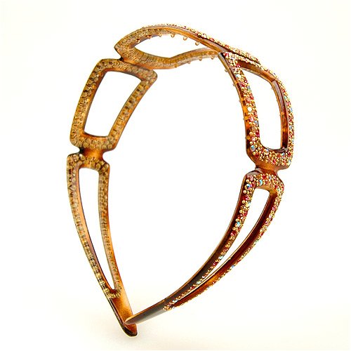 More than 350 Swarovski crystals in pink, champagne and iridescent hues are handset into the translucent brown base. Many more tiny golden studs are scattered about to further reflect light and play up the highlights in your hair. More than 1 1/2 inches at the widest point, this headband is comfortable to wear and will keep your hair put in the style you choose.
