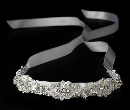 Product Description: This gorgeous white or ivory ribbon bridal hair headband is an elegant alternative to a silver or gold headpiece. There are five stunning rhinestone encrusted vintage swirl pieces that are interlinked for flexibility to tie around your hair style.Size: Ribbon Measures 50" Long - Ornament Design Measures 9-3/4" Long x 1" High