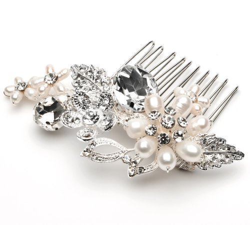 Product Description: Mystic Pearl Side Comb is both delicate and robust. This wedding comb features a stunning floral and leaf design with fresh water pearls, glistening rhinestones and accented with large sparkling rhinestones all hand wired on a sterling silver plated setting. The ornamentation measures 3 1/4 inches long and 1 1/2 inches at its widest point. The fresh water pearls are a soft white (off white) color. This stunning wedding comb coordinates with any color wedding dress or formal ensemble.