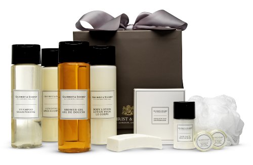 Packaged with simple, elegant gift-giving in mind, this exclusive gift set features an 8oz. London Collection Shampoo, Conditioner, Shower Gel, Body Lotion, 1.5oz. Bath Salts, 2.5oz. Exfoliating Soap Set (four bars), two .2oz. Lip Balms, and a Bath Puff, packaged in a Gilchrist & Soames gift box.
