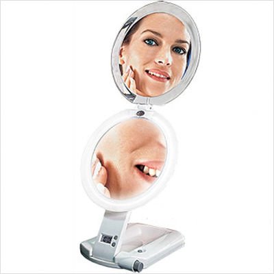 Product Description: ULT110 Zadro makeup mirror shown in a crystal white finishThis is the ultimate makeup mirror which provides you with 2 convenient mirrors. With its illuminated 1x and 10x magnification mirrors you'll get the light that you really need to apply make-up. This mirror offers a 360-degree swivel design so you can put the lens at the angle you prefer. A travel pouch is included so you can bring this makeup mirror with you wherever you go! Features: -Elegant crystal white finish. -Adjustable height control to a high 16''. -Lifetime bulb. -Closes to a mere 1''. -360 Degree swivel *** AC adapter NOT included ***