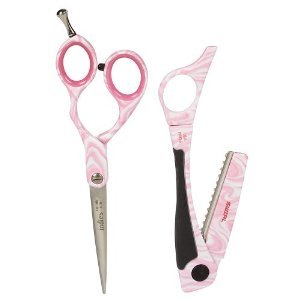Product Details: Product Description: *Pink Swirl shear 5.5" -Hollow-ground, convex blades, Japanese steel, permanent fused finish, ergonomic crane handle design, detachable finger rest.*Pink Swirl Texture razor -Swivel finger ring. Articulated joint. Non-slip handle, blade guard*Free 10 pack thinning blades (8-tooth)