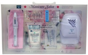 Product Details: Product Description: The Manicure Salon Professional Manicure Set- offers a professional style manicure in the comfort of your own home. Makes a wonderful gift - - loaded with great items! 1. The MANICURE TOOL with 5 (five] precision - crafted attachments that sculpt, shape, and polish nails quickly and safely - - works great on feet too! 2. PRECISION MANICURE IMPLEMENTS includes a Cuticle Trimmer, Nail Clipper, Scissors, & Tweezers - - in a compact travel - friendly case. 3. Four Sided Filing Block - This unique Filing Block has four surfaces, from coarse to superfine. 4. Nail Brush - After filing and buffing nails use the Nail Brush to clean under nails and to buff nail bed and nail tip. 5. NAIL DRYER is portable (runs on 2 "AA" batteries {not included}] no cumbersome wires to deal with, great for feet too! 6. Our NAIL & CUTICLE CARE the very best in conditioning treatments to complete your manicure. VOTED BEST NAIL CARE PRODUCT by HEALTH MAGAZINE IN 2000, we are confident you will find it to be one of your Earth Therapeutics favorites.if you haven't already.