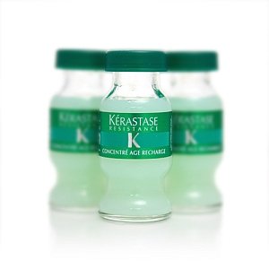 Product Description: Kerastase Resistance Concentre Age Recharge is a refilling and lipo-repleneshing dual repair care for hair losing vitality and suppleness. This treatment gives instant long-lasting, lightweight nourishment that deeply penetrates the hair. Directions: Massage product through lengths and ends of shampooed and towel-dried hair. Leave on for 3-5 minutes. Rinse thoroughly. [3 X 0.4 oz vials]